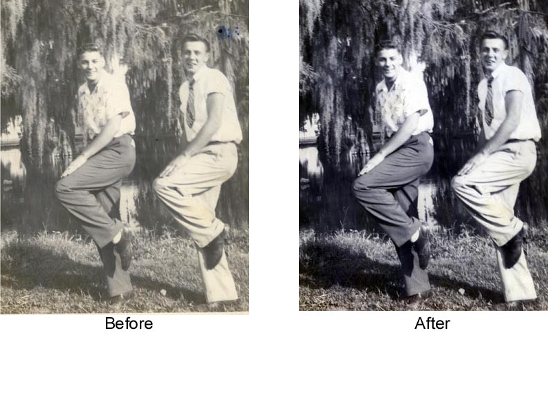 | LIGHT PHOTO RESTORATION Don't forget to check out Extreme and Heavy Restoration samples. Click on the images shown on this page to get an enlarged before and after view of the changes. Please note: These photos are lower quality versions of the originals, which may differ slightly, in order to make them load in your browser window as quickly as possible. Also, every monitor displays color differently, which may not reflect the actual colors of the restored photographs. |