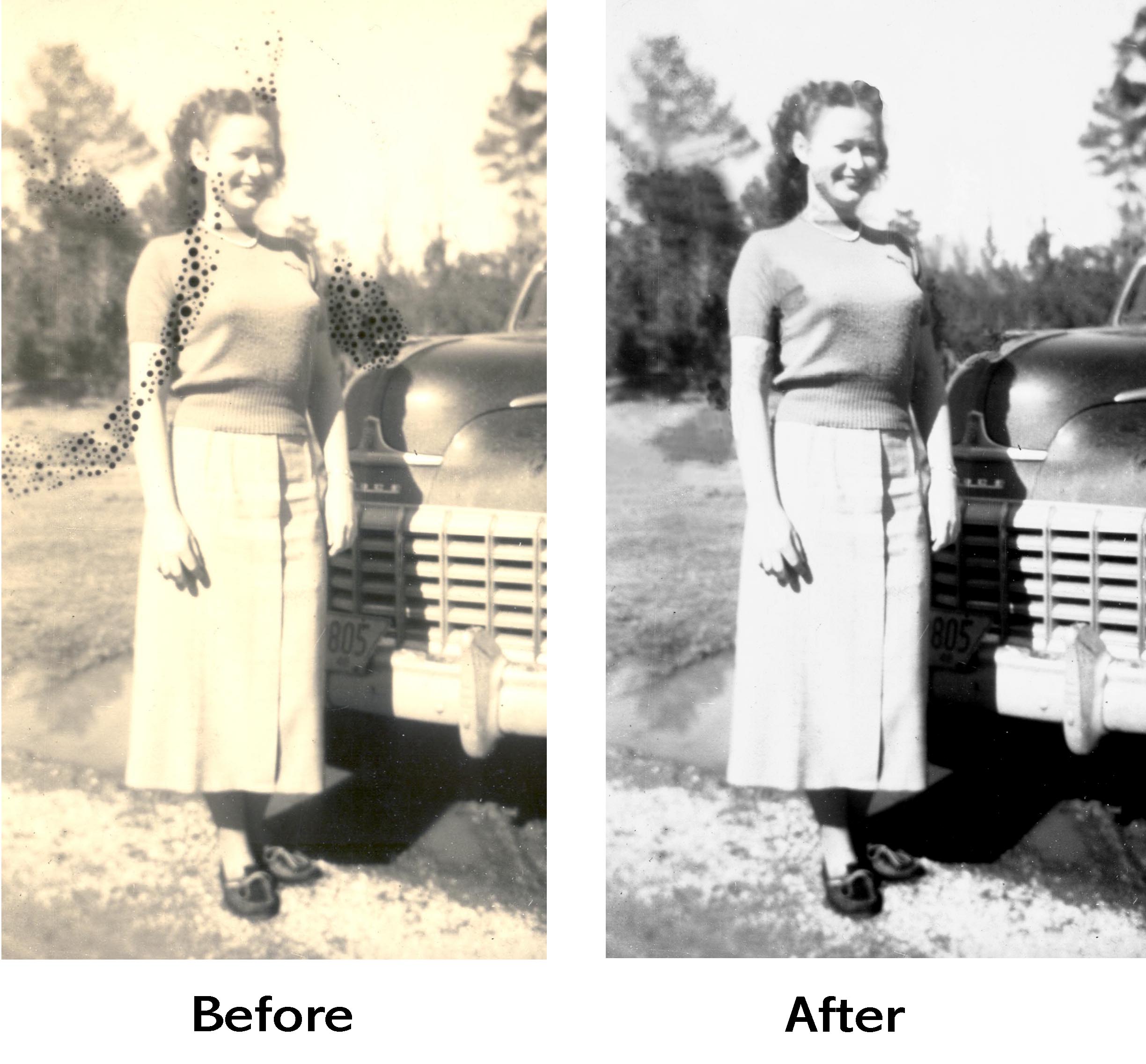 Click on the images shown on this page to get an enlarged before and after view of the changes. Please note: These photos are lower quality versions of the originals, which may differ slightly, in order to make them load in your browser window as quickly as possible. Also, every monitor displays color differently, which may not reflect the actual colors of the restored photographs.